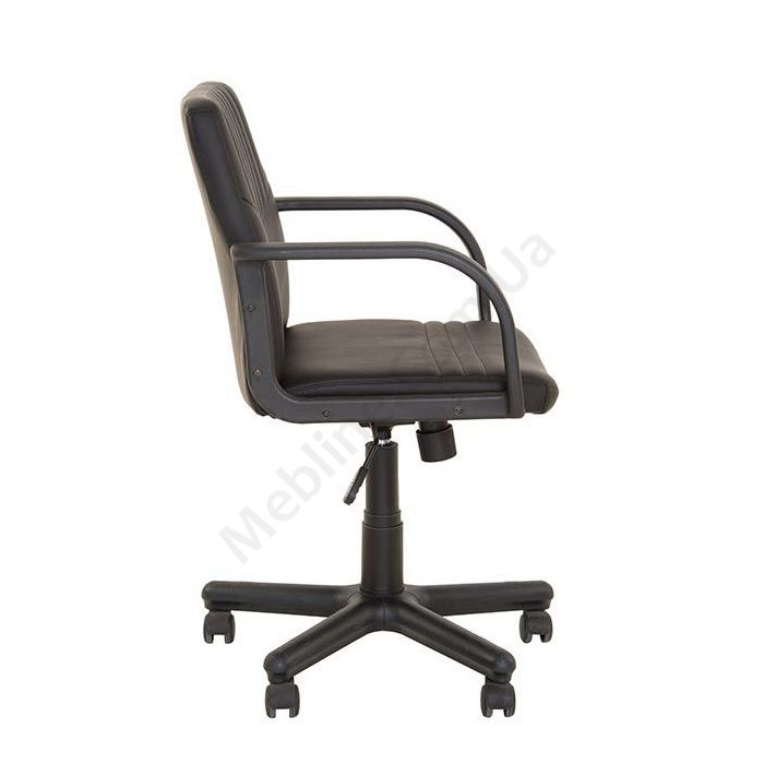 Бюджетне крісло керівника з нерегульованими пластиковими підлокітниками, фіксацією у вертикальному положенні, на металевій основі з пластиковими накладками.