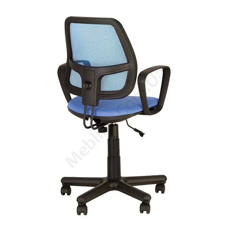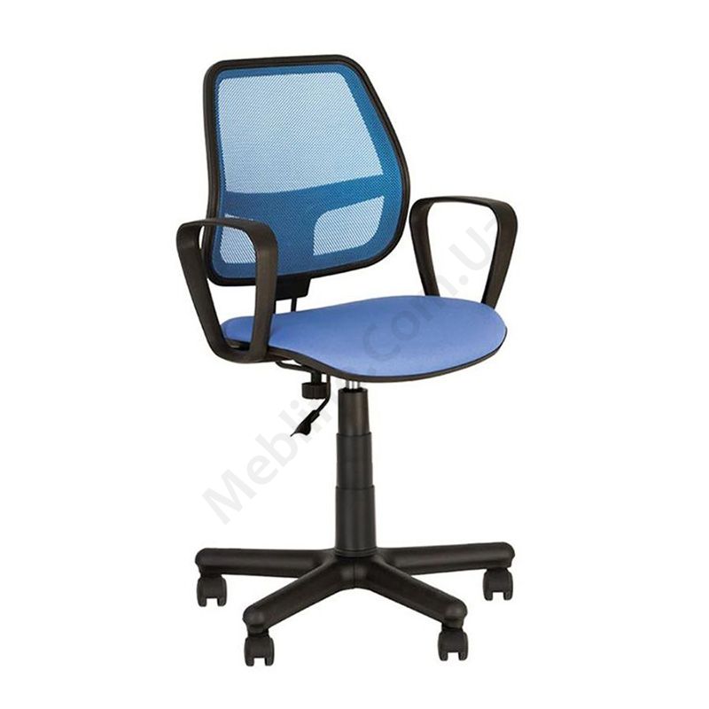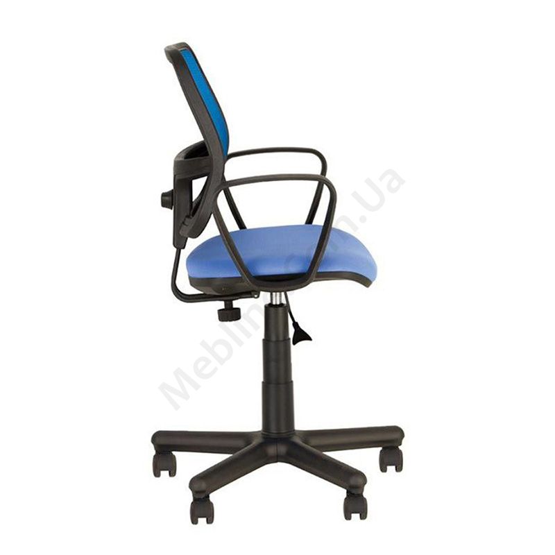 Сучасне операторське крісло з дихаючою спинкою, нерегульованими пластиковими підлокітниками, на металевій основі з пластиковими накладками.