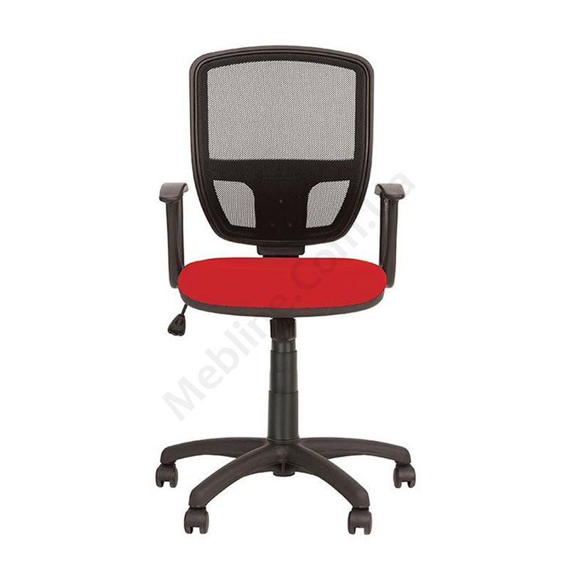 Сучасне операторське крісло з дихаючою спинкою, нерегульованими пластиковими підлокітниками, фіксацією у вертикальному положенні, на пластиковій основі.