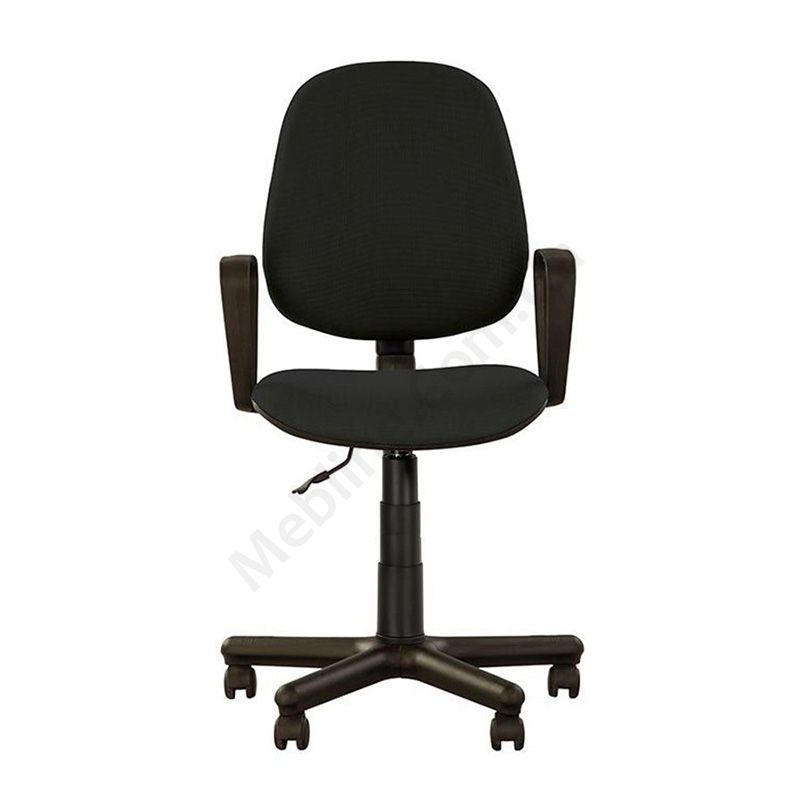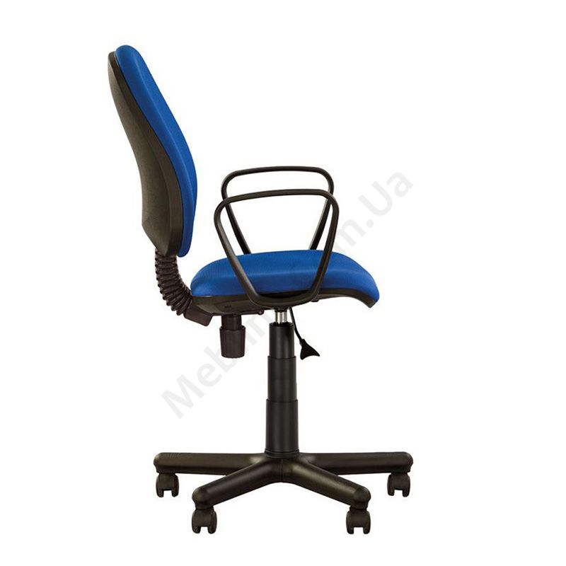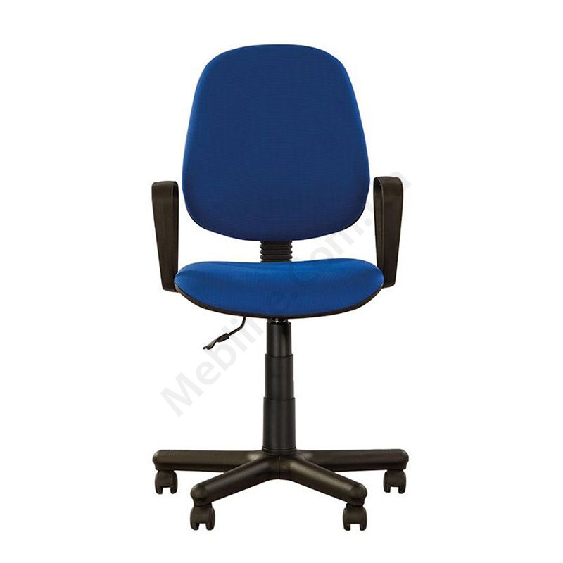 Просте операторське крісло з нерегульованими пластиковими підлокітниками, функцією постійного гойдання, на металевій основі з пластиковими накладками.