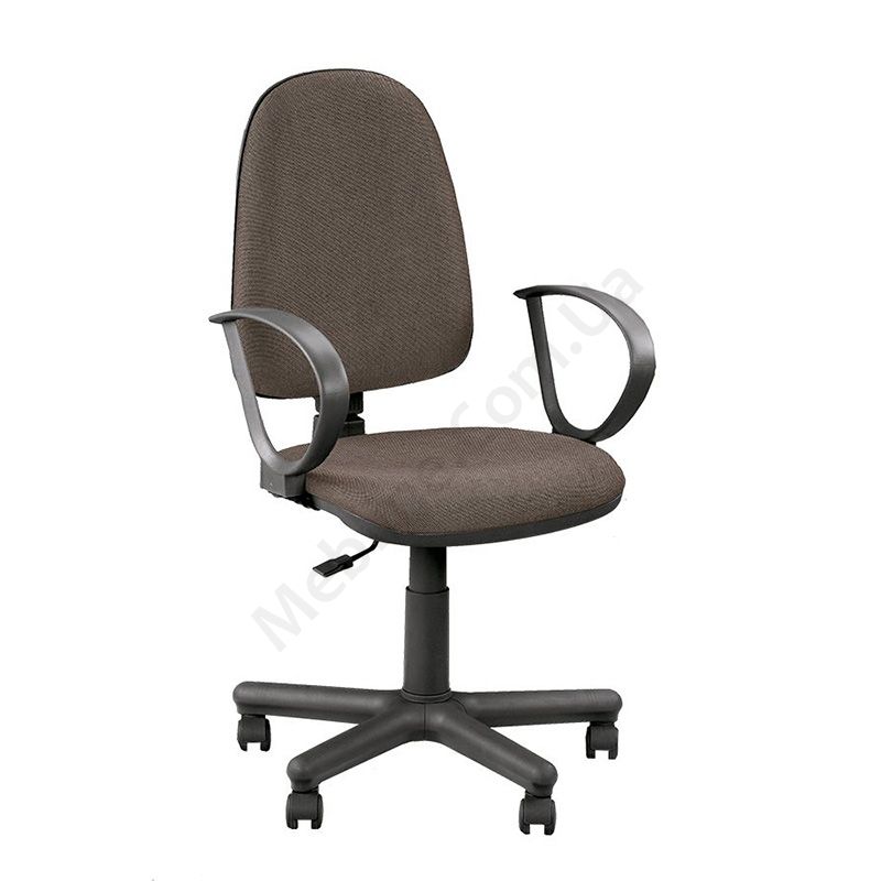 Лаконічне операторське крісло з підлокітниками, функцією постійного гойдання, на металевій основі з пластиковими накладками.
