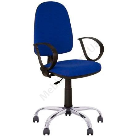 Лаконічне операторське крісло з підлокітниками, ручним регулюванням, на хромованій основі.