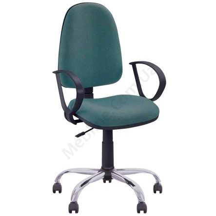 Лаконічне операторське крісло з підлокітниками, сидінням та спинкою покращеної ергономіки, ручним регулюванням, на хромованій основі.