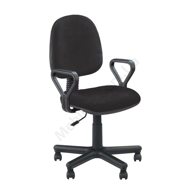 Бюджетне операторське крісло з підлокітниками, сидінням та спинкою покращеної ергономіки, на металевій основі з пластиковими накладками.