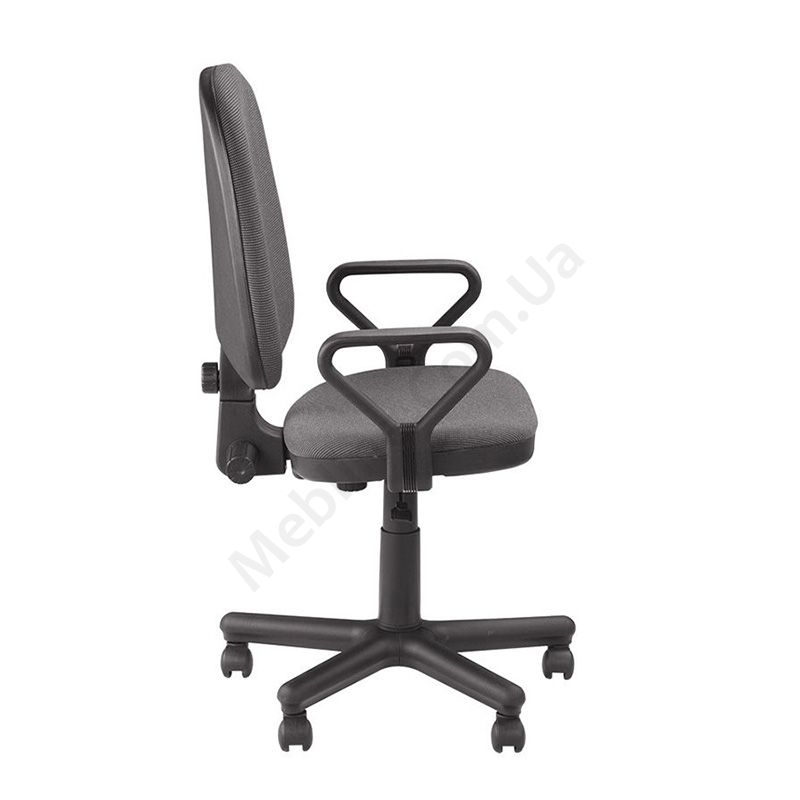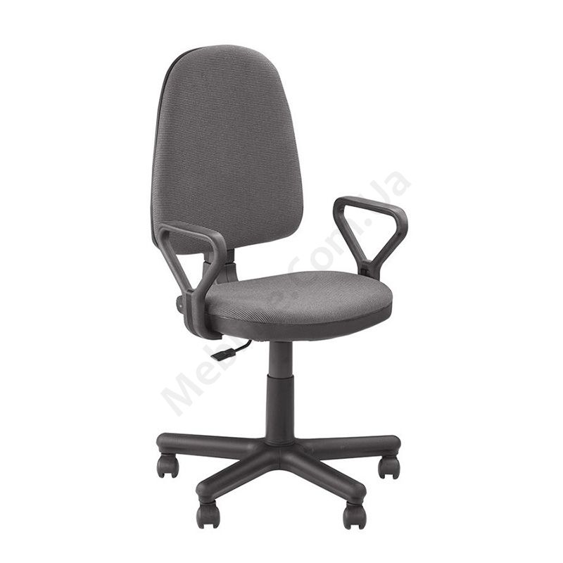 Стандартне операторське крісло з підлокітниками, ручним регулюванням, на металевій основі з пластиковими накладками.