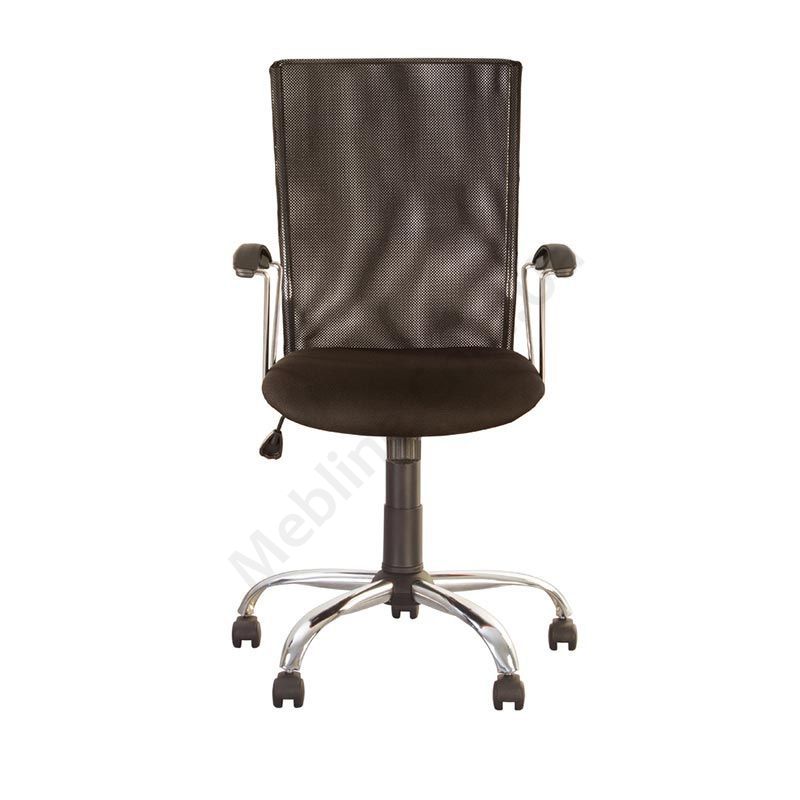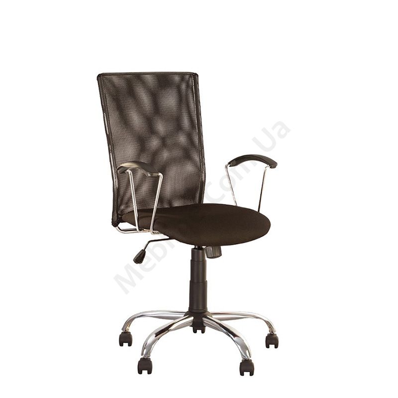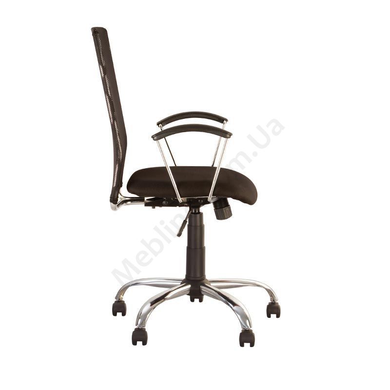 Операторське крісло з широкою дихаючою спинкою, металевими підлокітниками з поліуретановими накладками, фіксацією у вертикальному положенні, на хромованій основі.