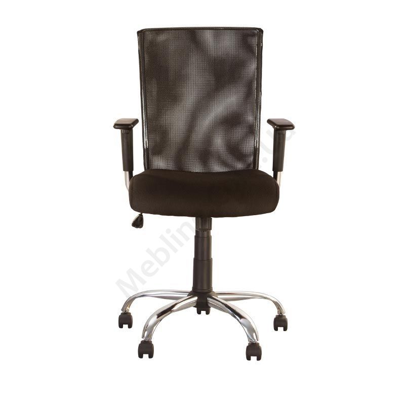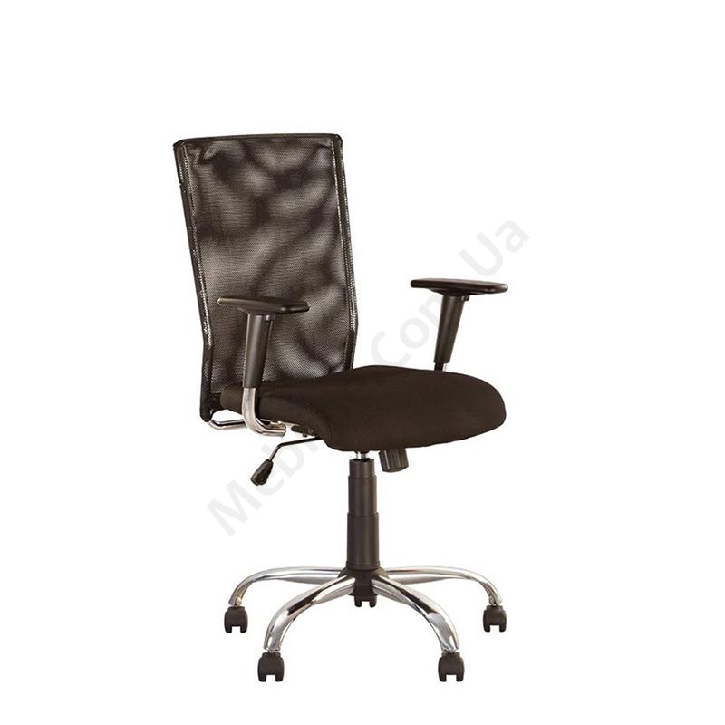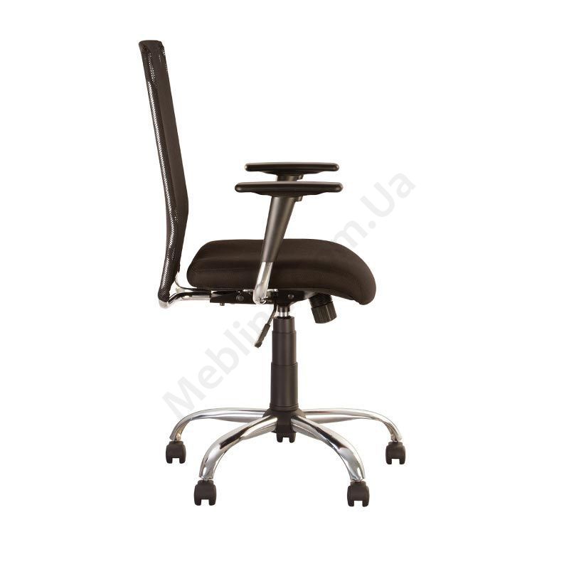 Операторське крісло з широкою дихаючою спинкою, регульованим підлокітниками, фіксацією у вертикальному положенні, на хромованій основі.