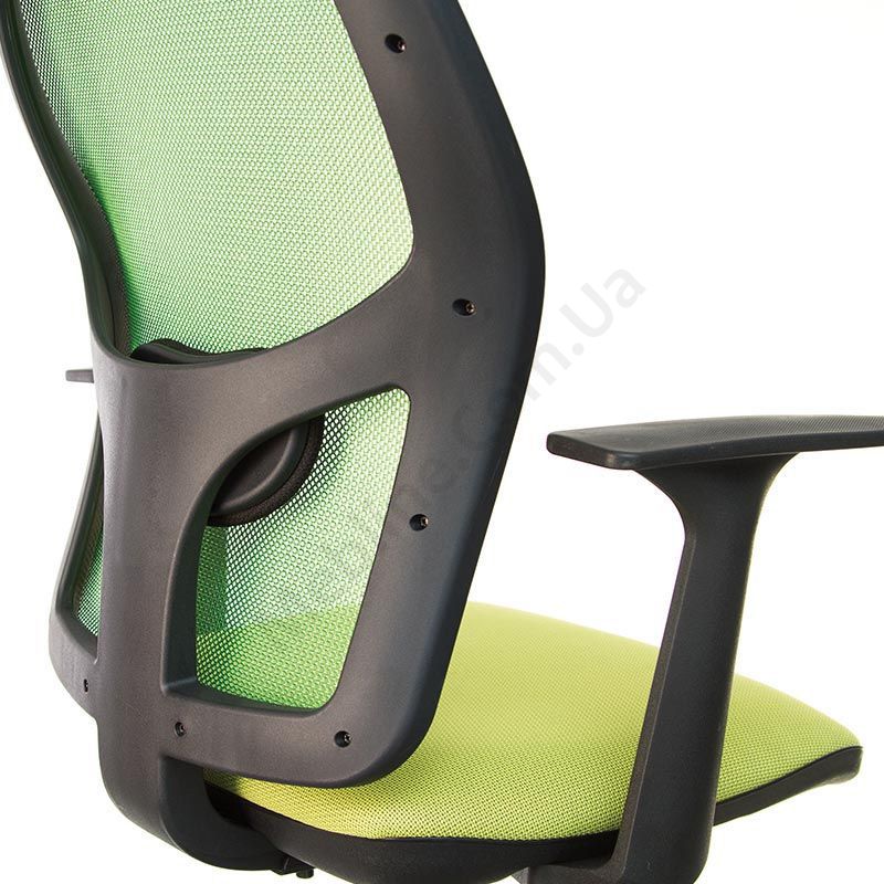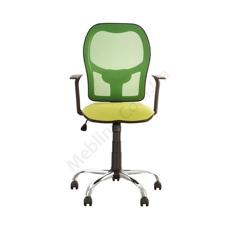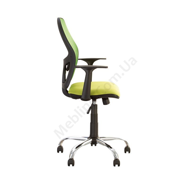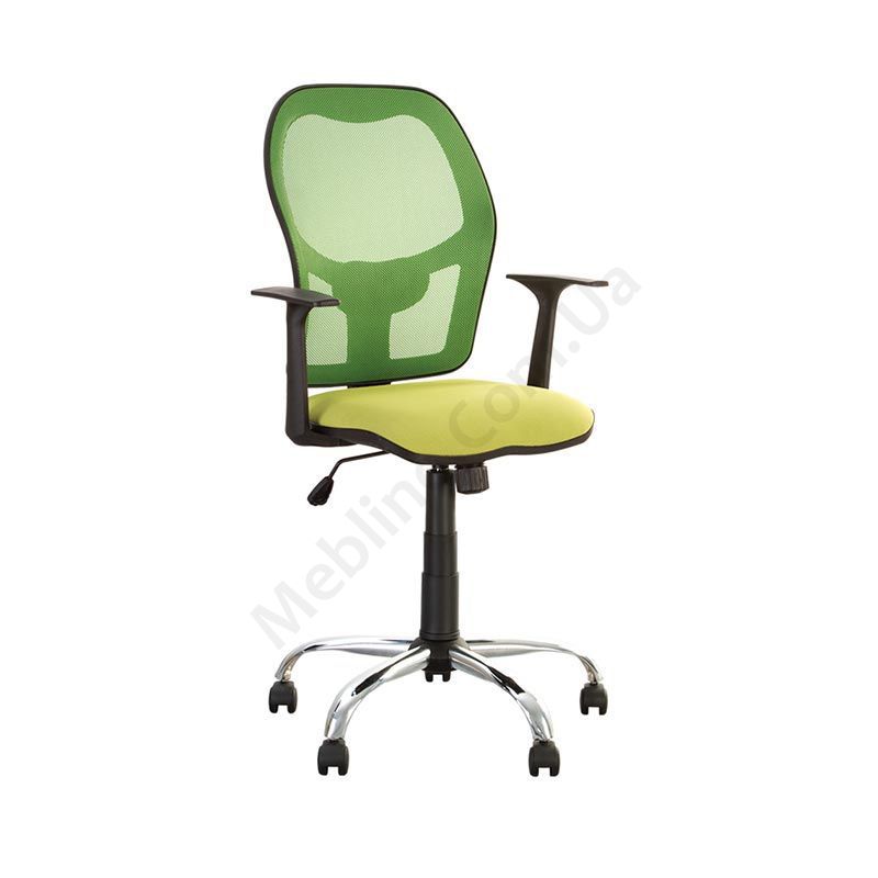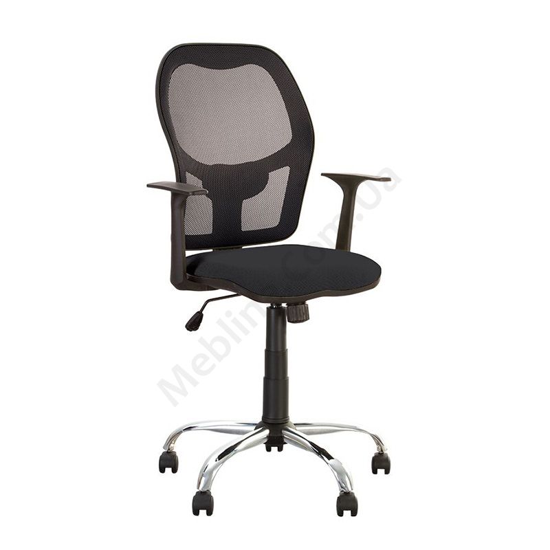 Зручне операторське крісло з дихаючою спинкою, регульованими пластиковими підлокітниками, фіксацією у вертикальному положенні, на хромованій основі.