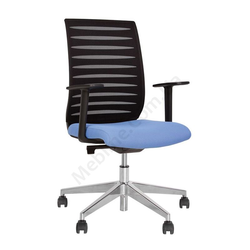 Стильне операторське крісло з дихаючою спинкою, нерегульованими пластиковими підлокітниками, фіксацією у 3 положеннях, на алюмінієвій основі.