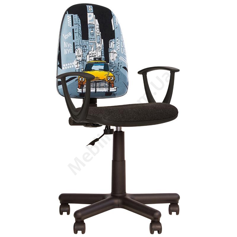 Дитяче поворотне крісло з високою спинкою, з підлокітниками, на пластиковій основі.