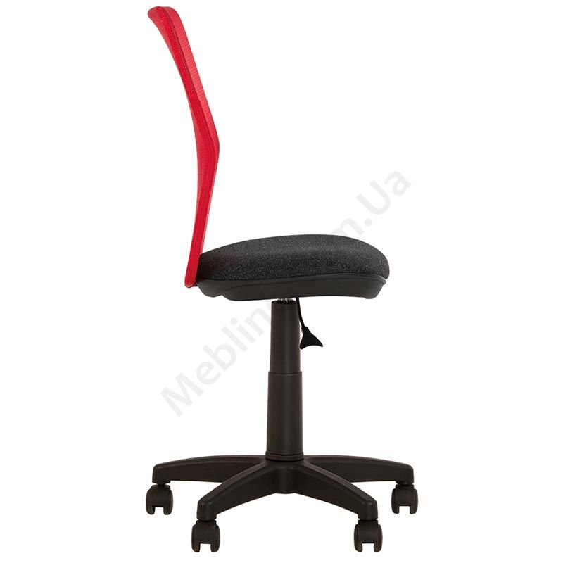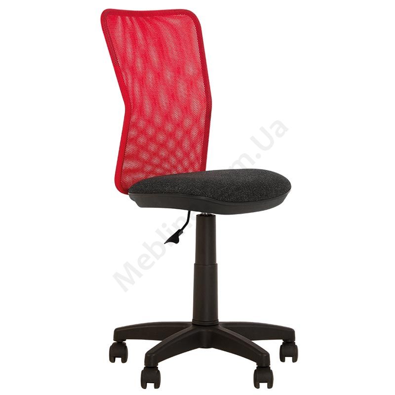 Дитяче поворотне крісло з високою дихаючою спинкою, без підлокітників, з профільованим сидінням, на чорній пластиковій основі.