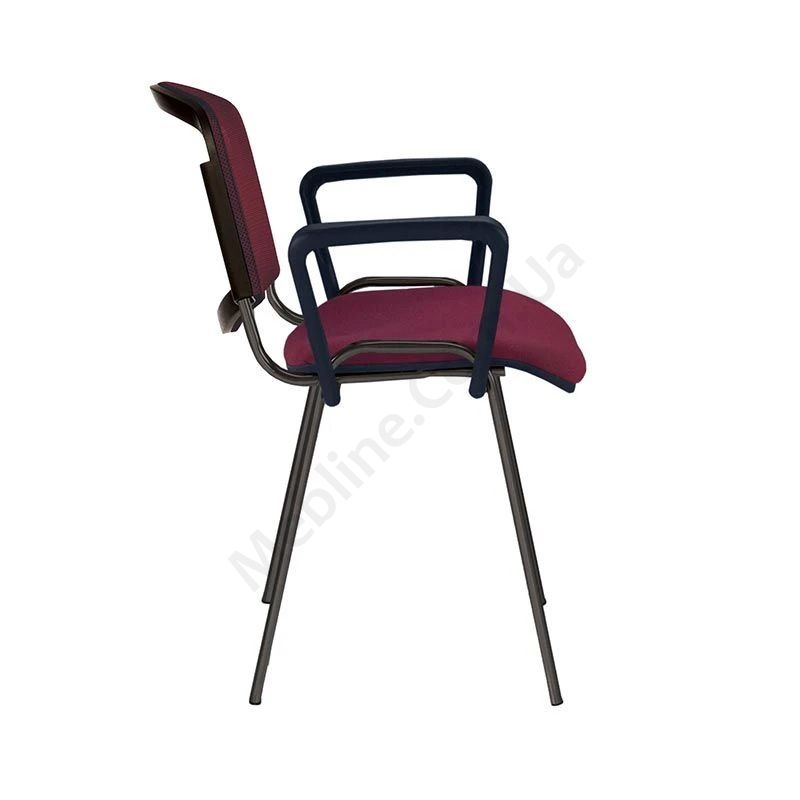 Стілець для відвідувачів, сітчастою спинкою, з підлокітниками на рамі чорного кольору.