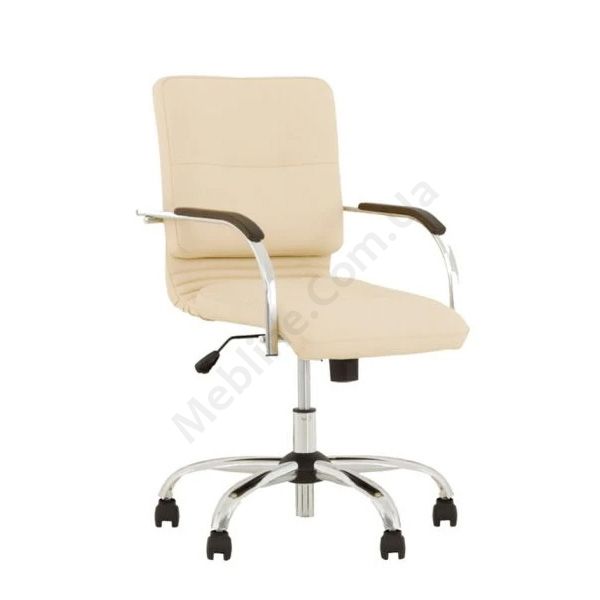 Офісне крісло в класичному стилі з ергономічним сидінням, дерев’яними накладками на підлокітники, фіксацією у вертикальному положенні, на хромованій основі.