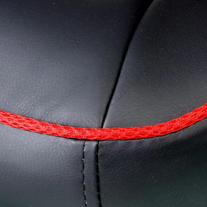 - Сидіння та спинка оббиті чорної артшкірою зі вставками з червоної меблевої тканини.