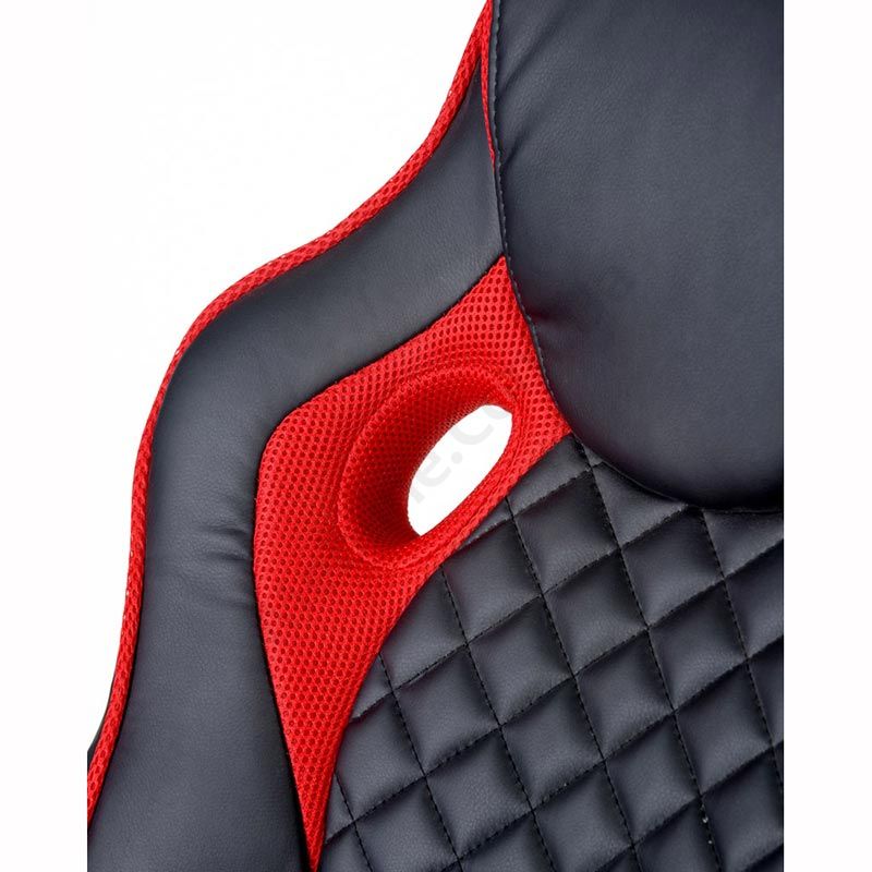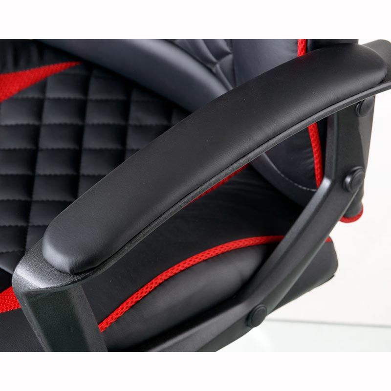 Чорно-червоне геймерське крісло з бічною підтримкою та підлокітниками.