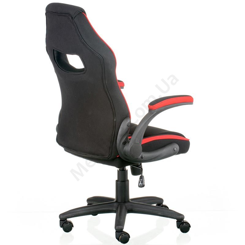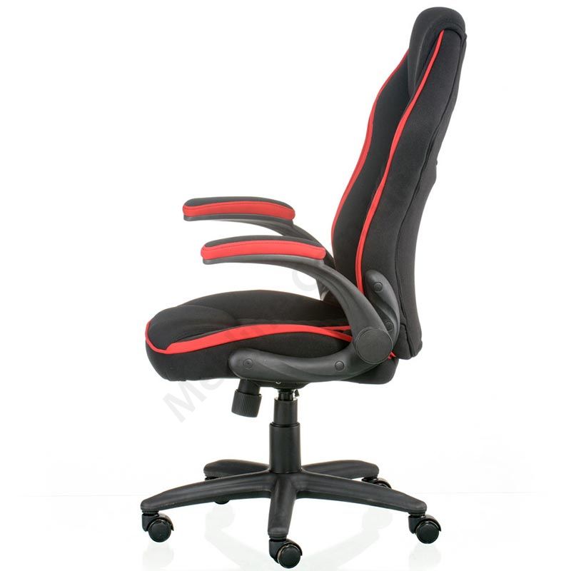 Чорно-червоне геймерське крісло з бічною підтримкою та регульованими підлокітниками.