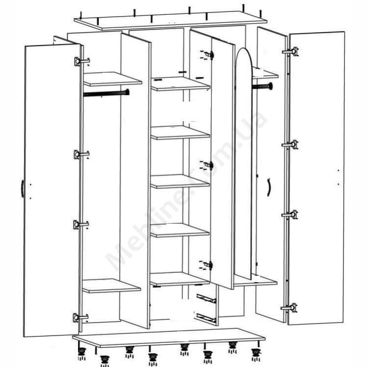 - За бічними дверцятами — штанги для одягу і по дві полиці.