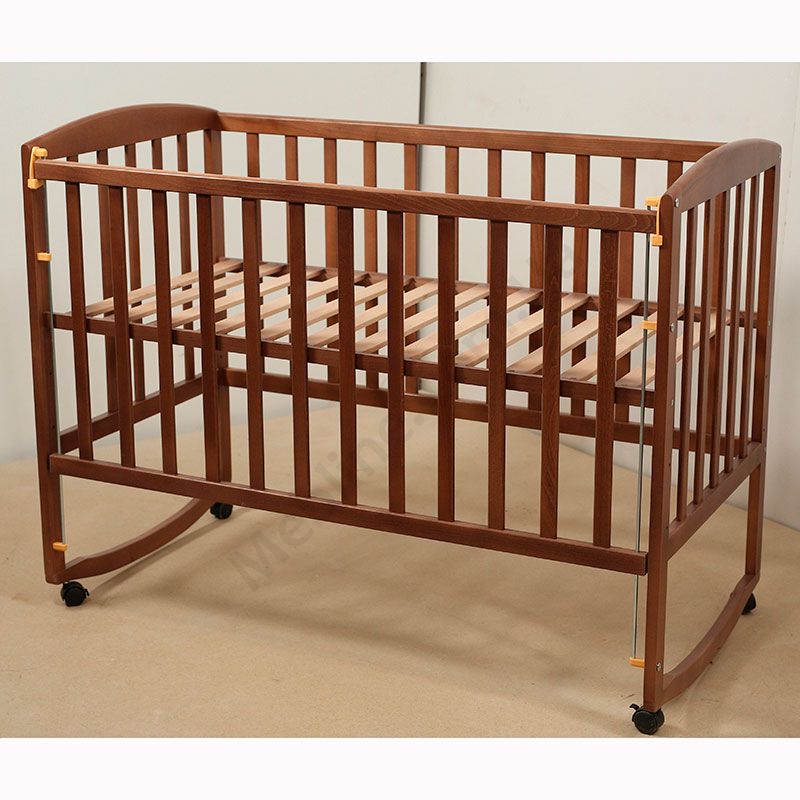 Дитяче дерев’яне ліжечко з рухомою боковиною, дугами внизу та знімними коліщатками.