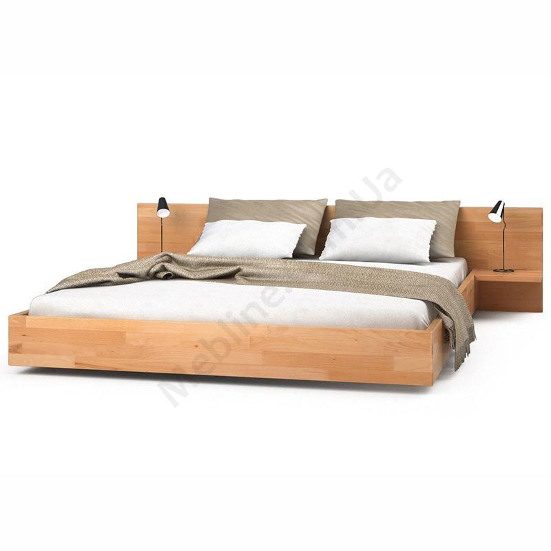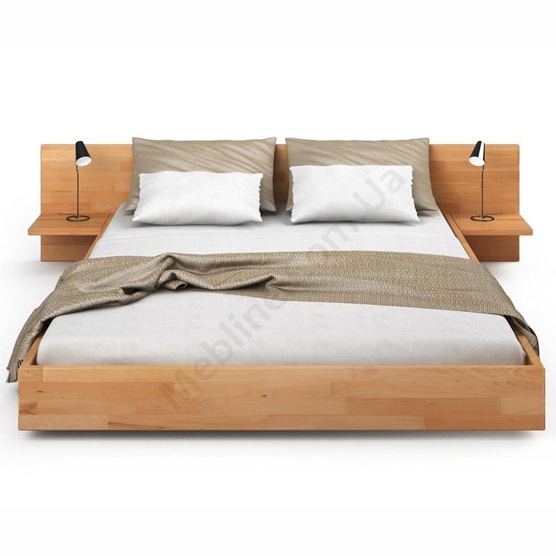 Двоспальне дерев’яне ліжко з приліжковими полицями.