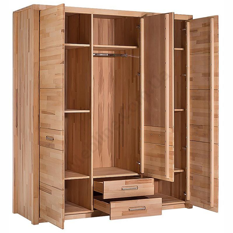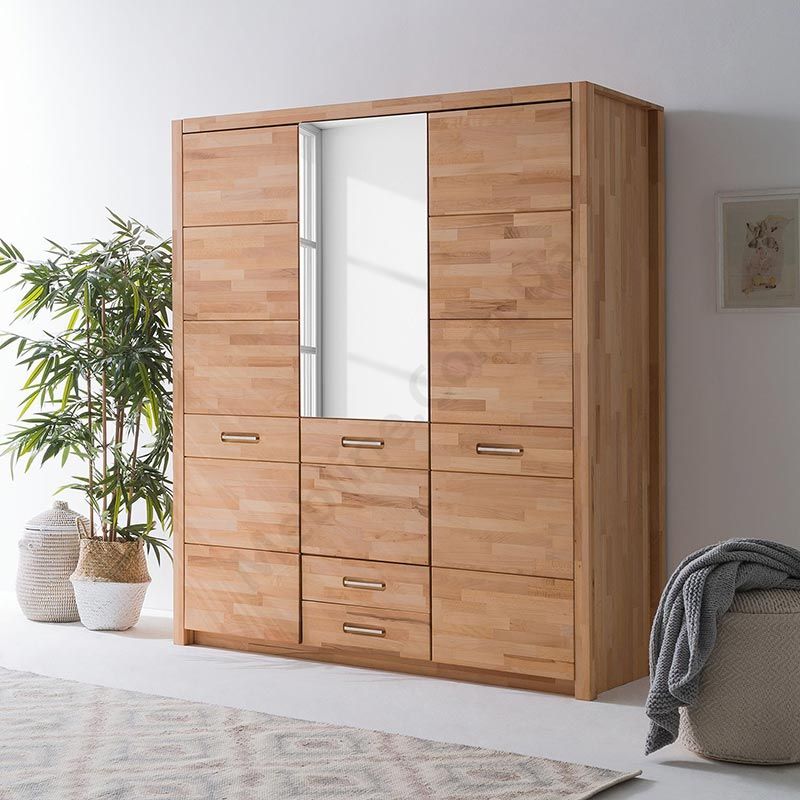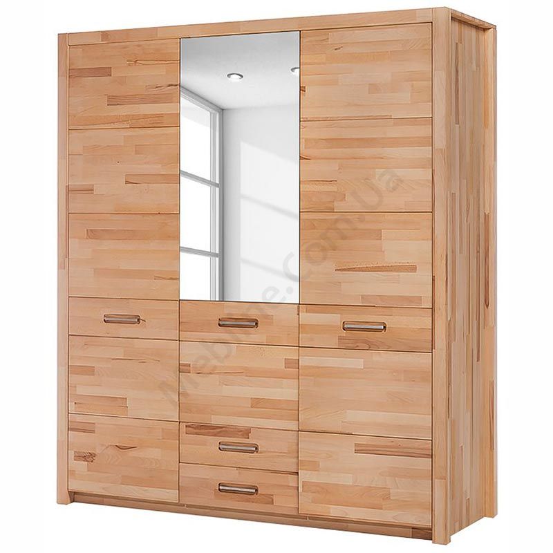 Дерев’яна тридверна шафа з дзеркалом, штангою для одягу, полицями та шухлядами.
