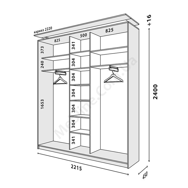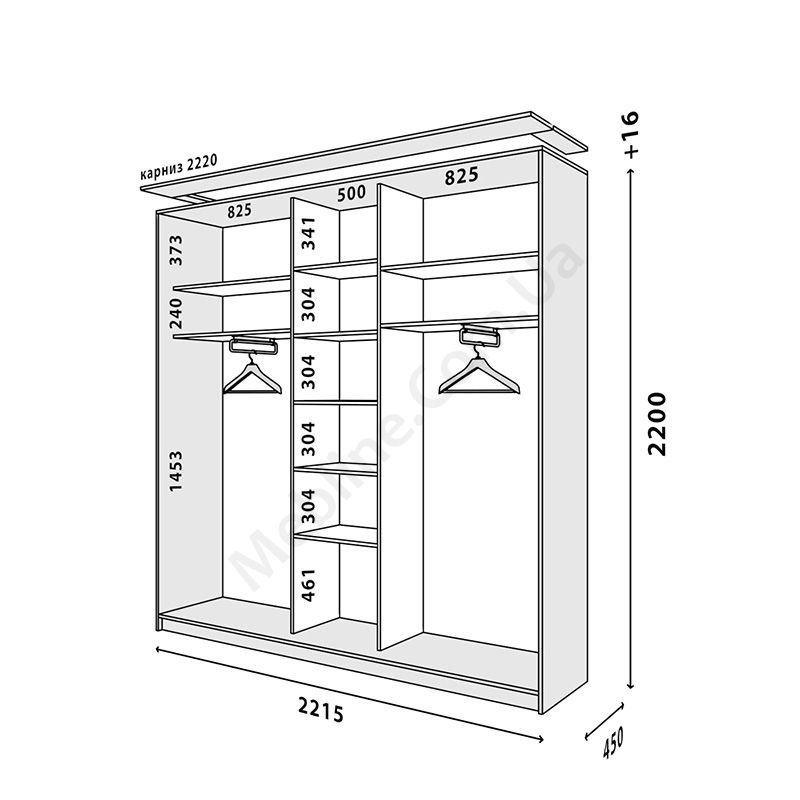Тридверна шафа-купе шириною 222 см, глибиною 45 см, висотою 220 чи 240 см