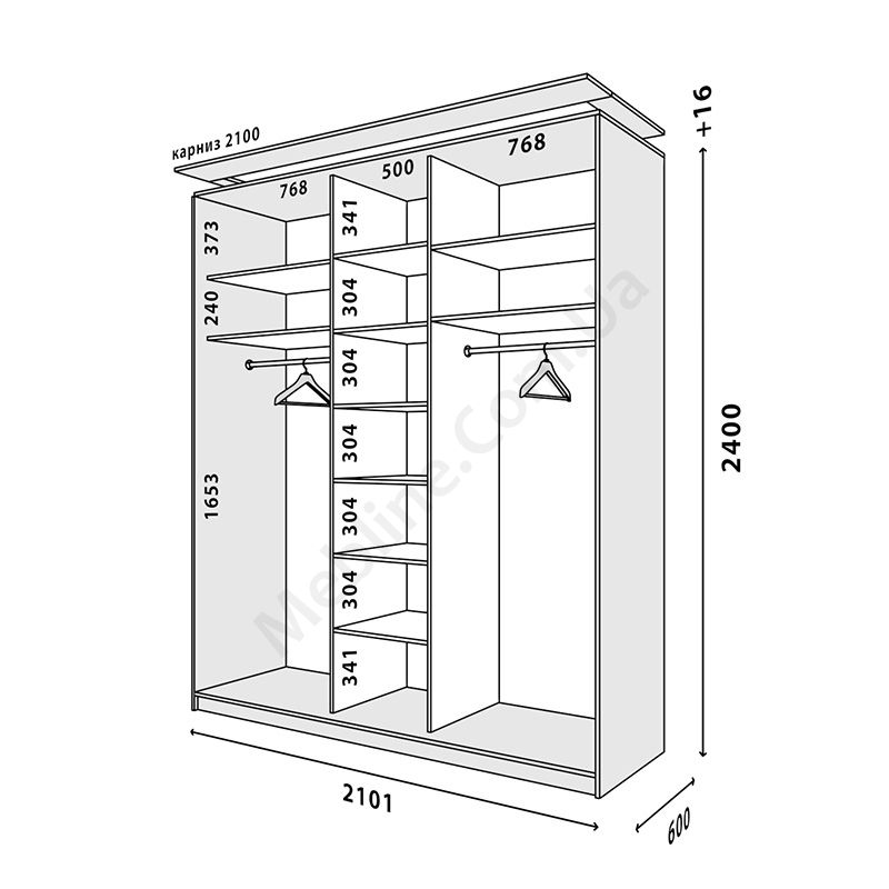 Тридверна шафа-купе шириною 210 см, глибиною 60 см, висотою 220 чи 240 см