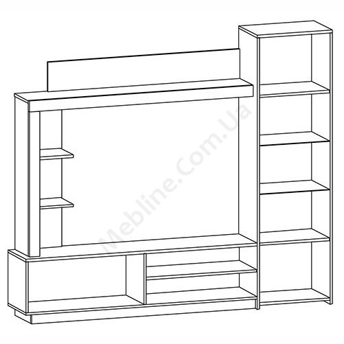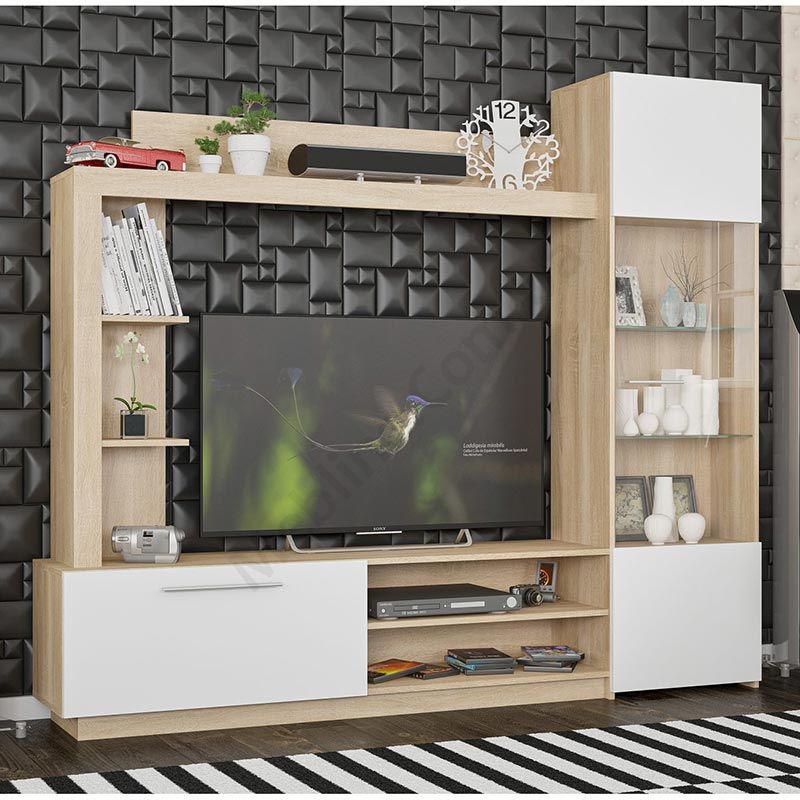 Стінка для вітальні з тумбою під телевізор, вітриною та полицями.
