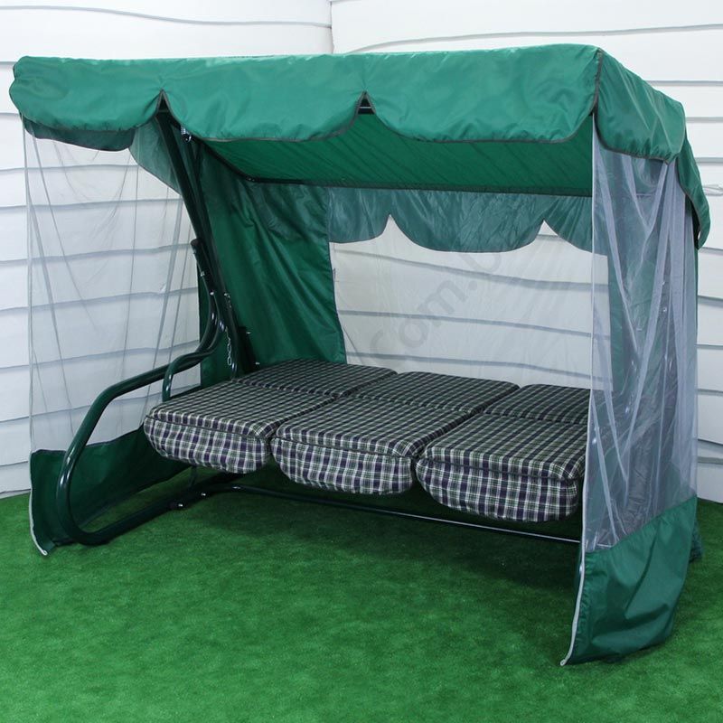 Садова гойдалка з відкидною спинкою та москітною сіткою на зеленому каркасі.