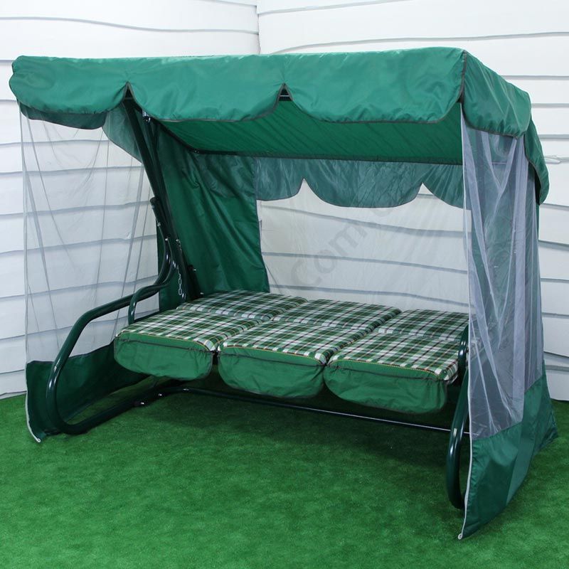 Садова гойдалка з відкидною спинкою та москітною сіткою на зеленому каркасі.