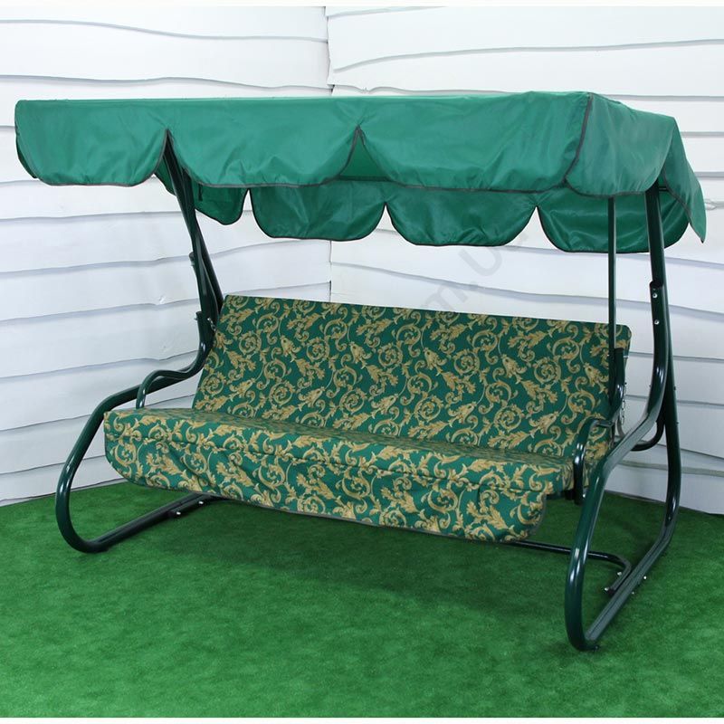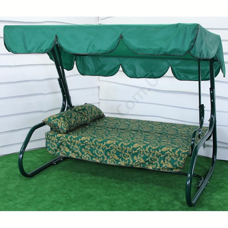 Садова гойдалка з відкидною спинкою на зеленому каркасі.