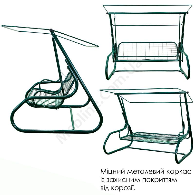 Садова гойдалка з відкидною спинкою на зеленому каркасі.