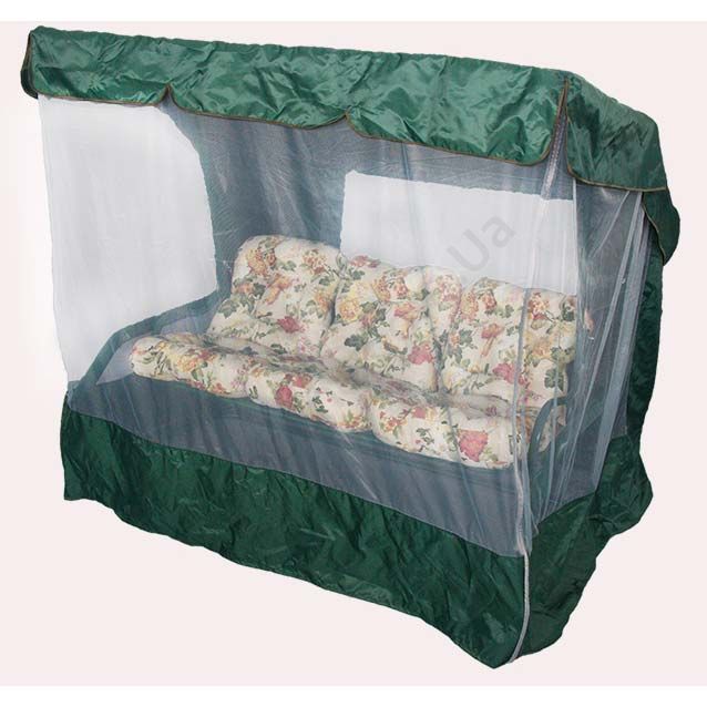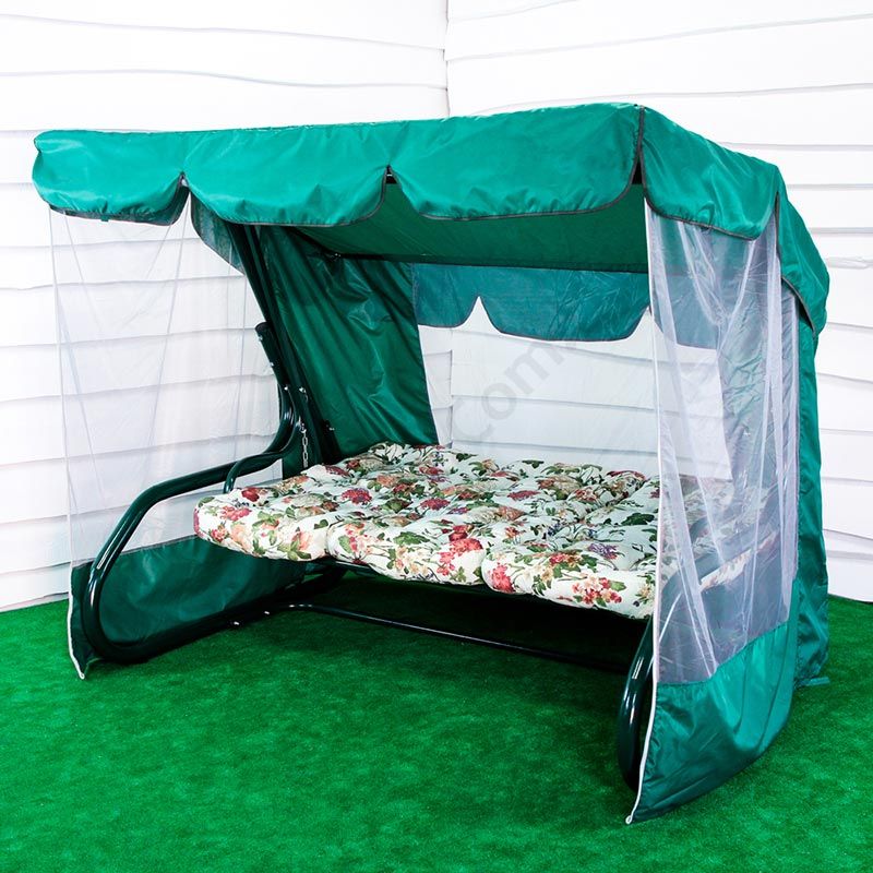 Садова гойдалка з відкидною спинкою та москітною сіткою на зеленому каркасі.