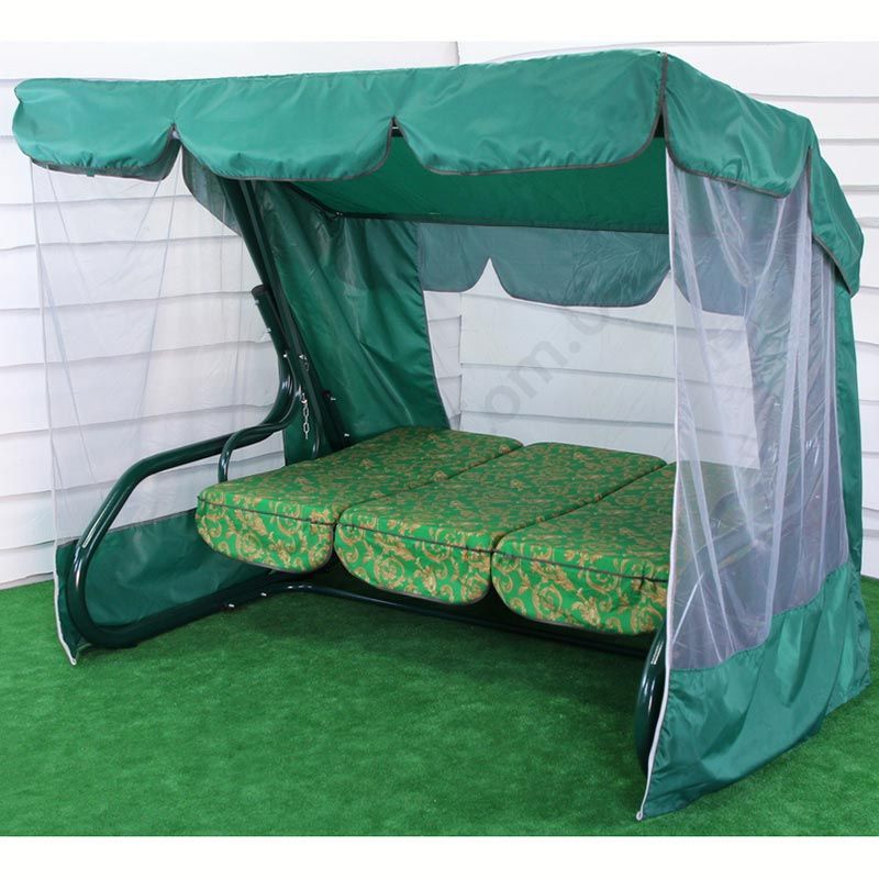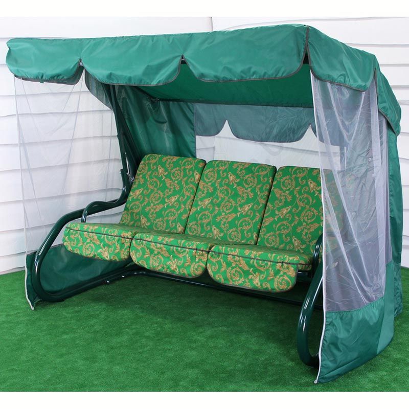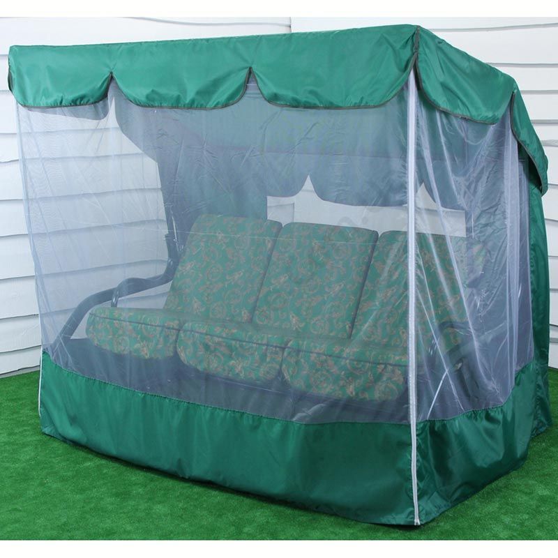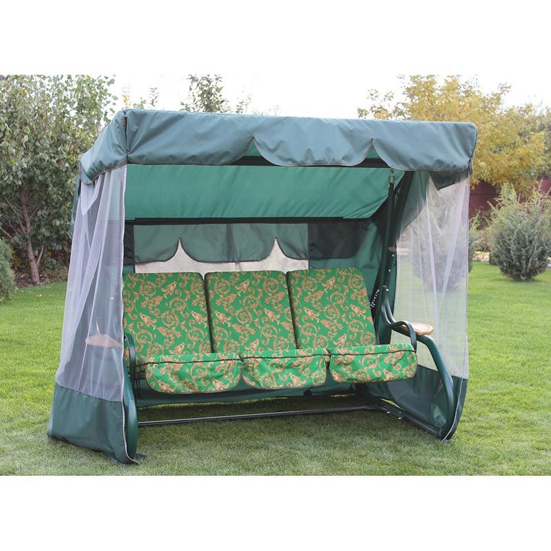 Садова гойдалка з відкидною спинкою та москітною сіткою на зеленому каркасі.