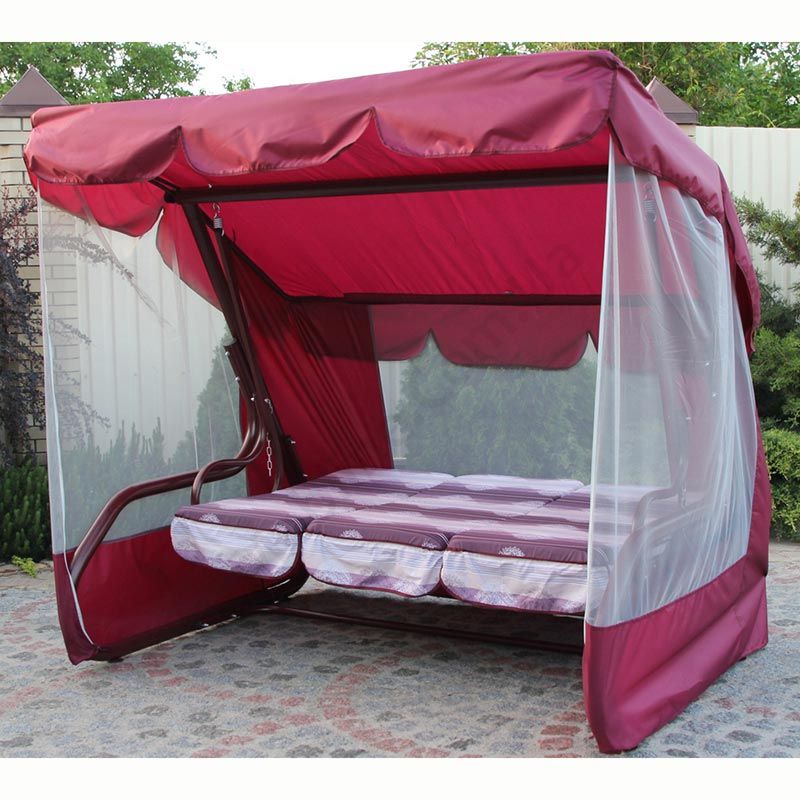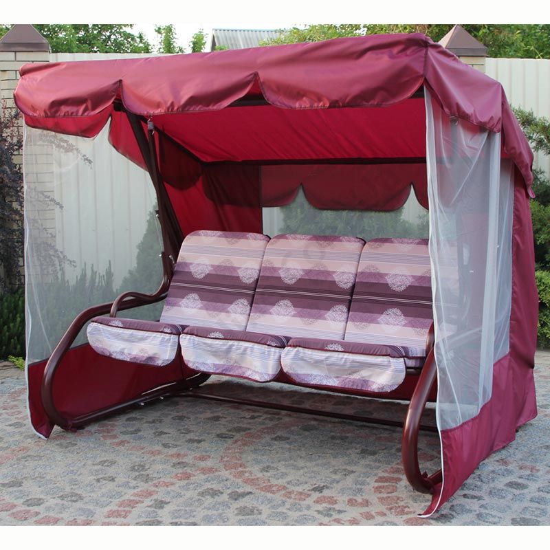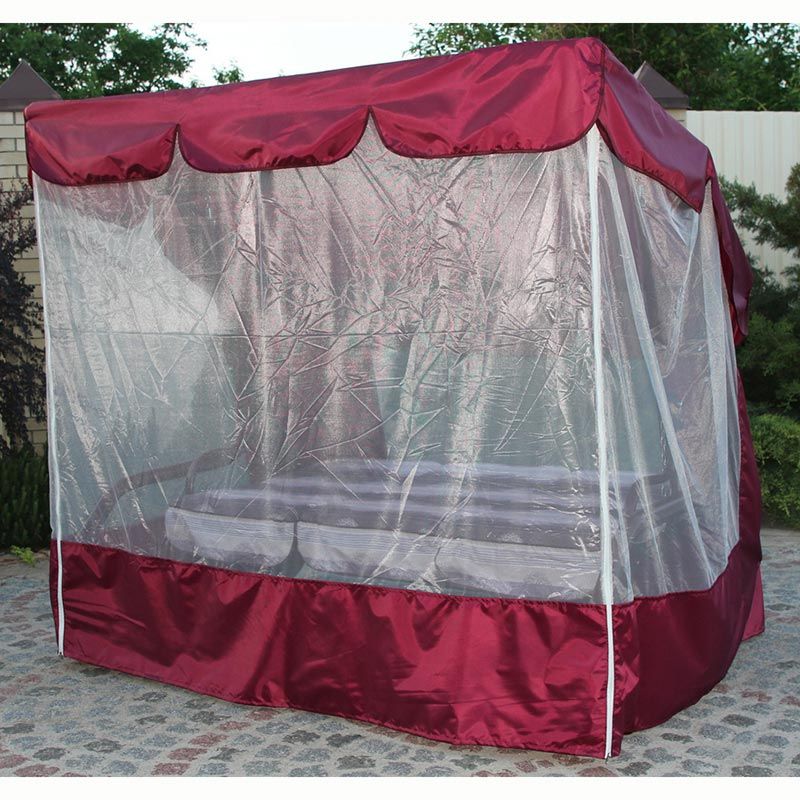 Садова гойдалка з відкидною спинкою та москітною сіткою на бордовому каркасі.