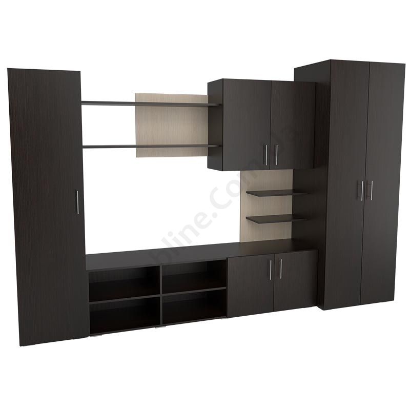 Виконано з ламінованої ДСП, завтовшки 16 мм.Кромка — ПВХ, завтовшки 0, 5 мм.Фурнітура — DC.Однодверний пенал з полицями всередині.Тумба під телевізор з двома розпашними дверцятами та відкритими полицями.Надставка з відкритими полицями та шафкоюз двома розпашними дверцятами.Шафа з двома розпашними дверцятами.За дверцятами штанга для одягу та верхня полиця.Глибина стінки без шафи — 450 мм.Можливе виконання у дзеркальному відображенні.
