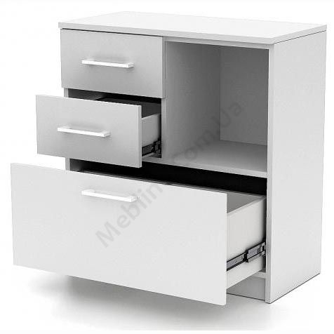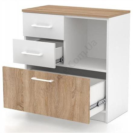Матеріал — ламінована ДСП Swiss Krono, завтовшки 16 мм.Екологічна безпека класу Е-1.ДСП має високу щільність.Фурнітура — DC та Linken.Протиударна кромка ПВХ, завтовшки 0, 5 та 2 мм.Ручки GTV (Польща).Одна відкрита полиця.Три висувні шухляди.Шухляди на роликових напрямних.Можливе встановлення телескопічних напрямних.Тумба може служити як продовження столу.