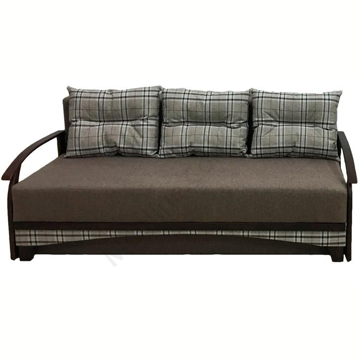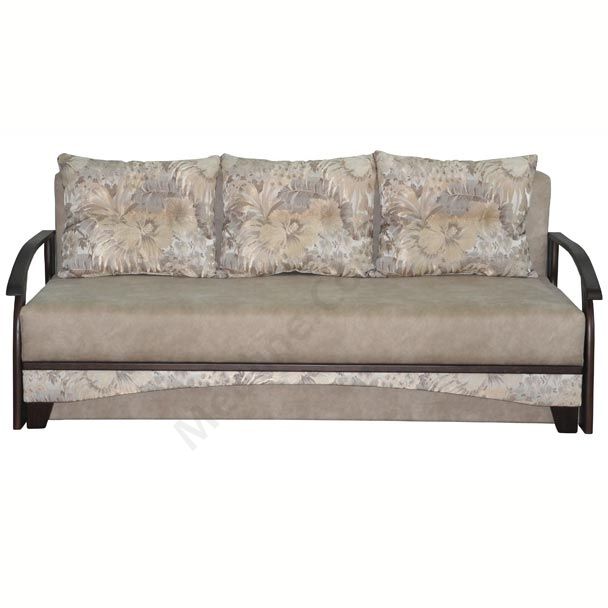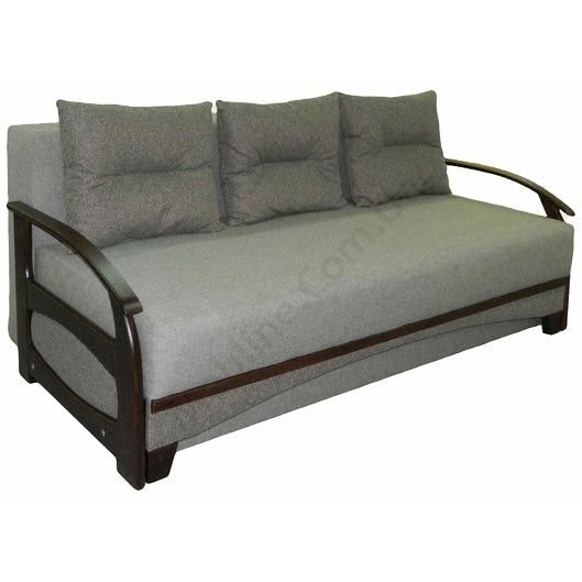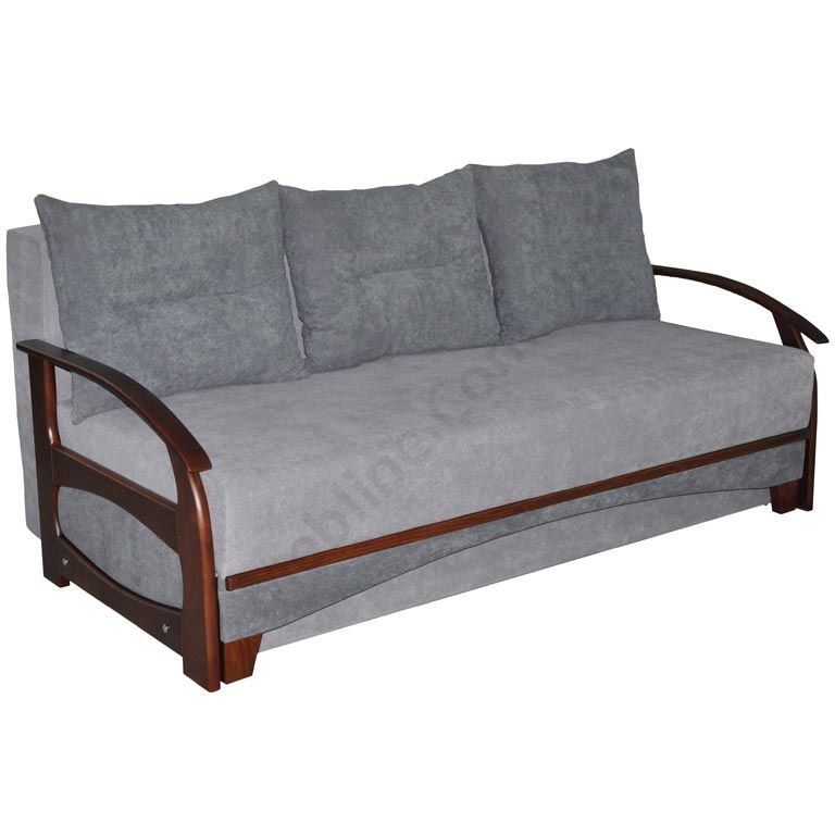 М’який розкладаний диван з дерев’яними підлокітниками.