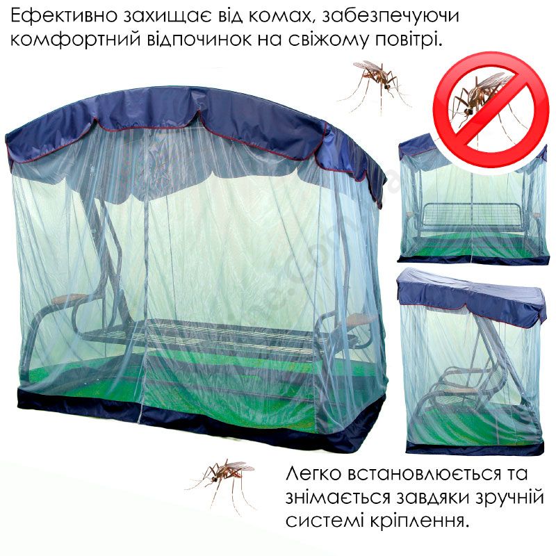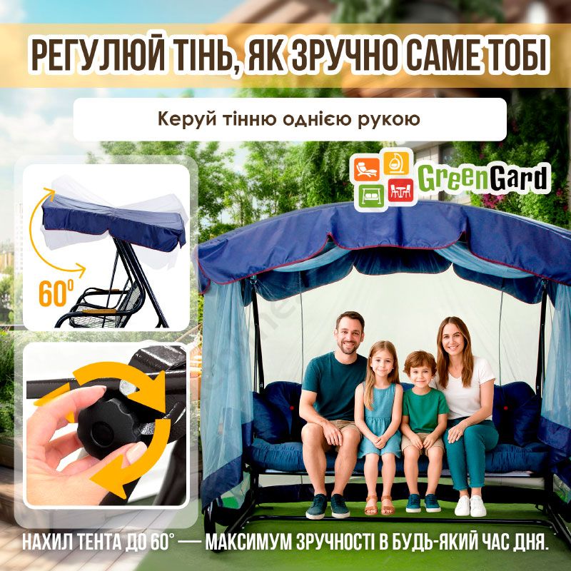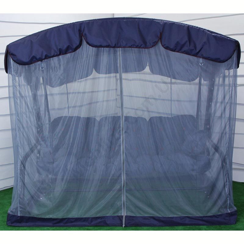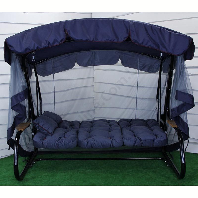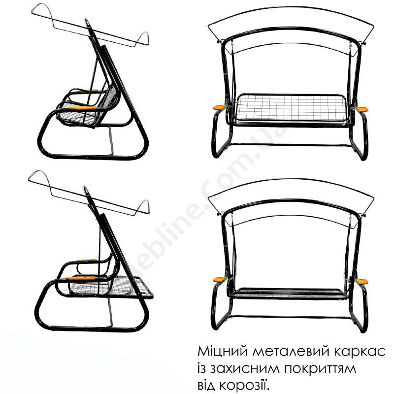 Садова гойдалка з відкидною спинкою та москітною сіткою на чорному каркасі.