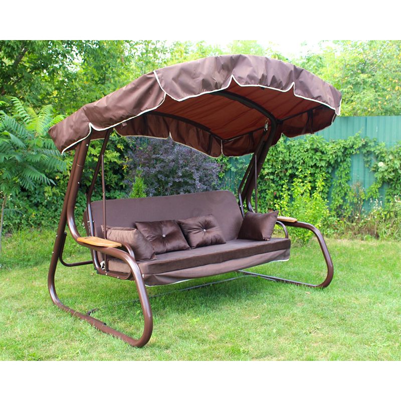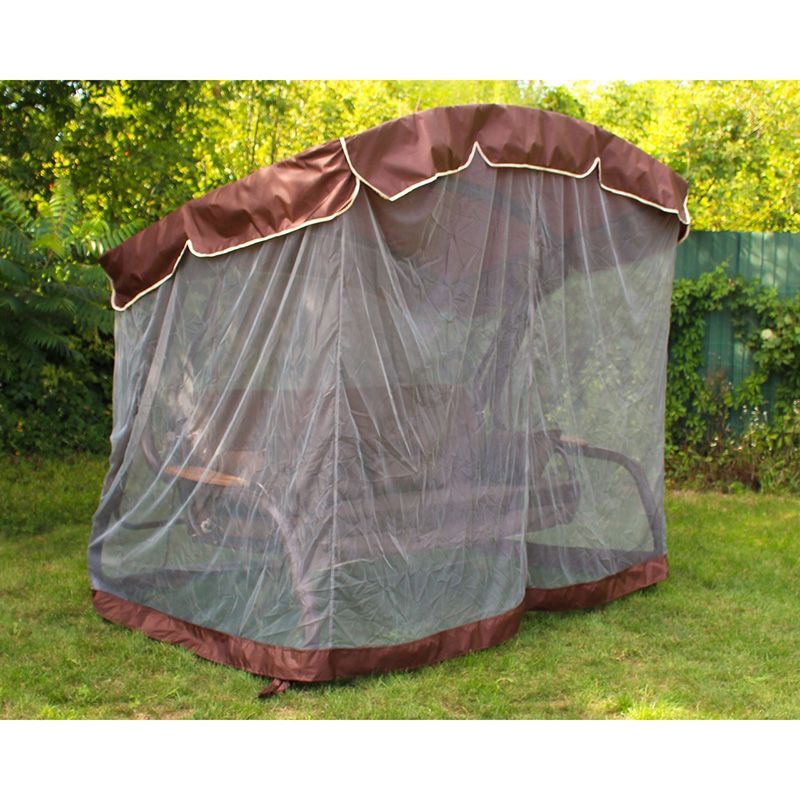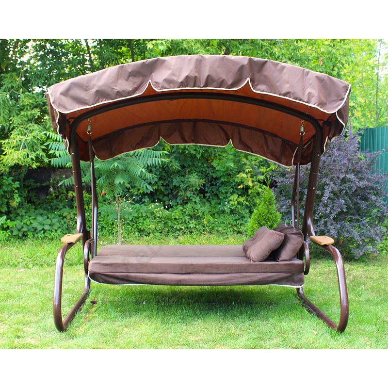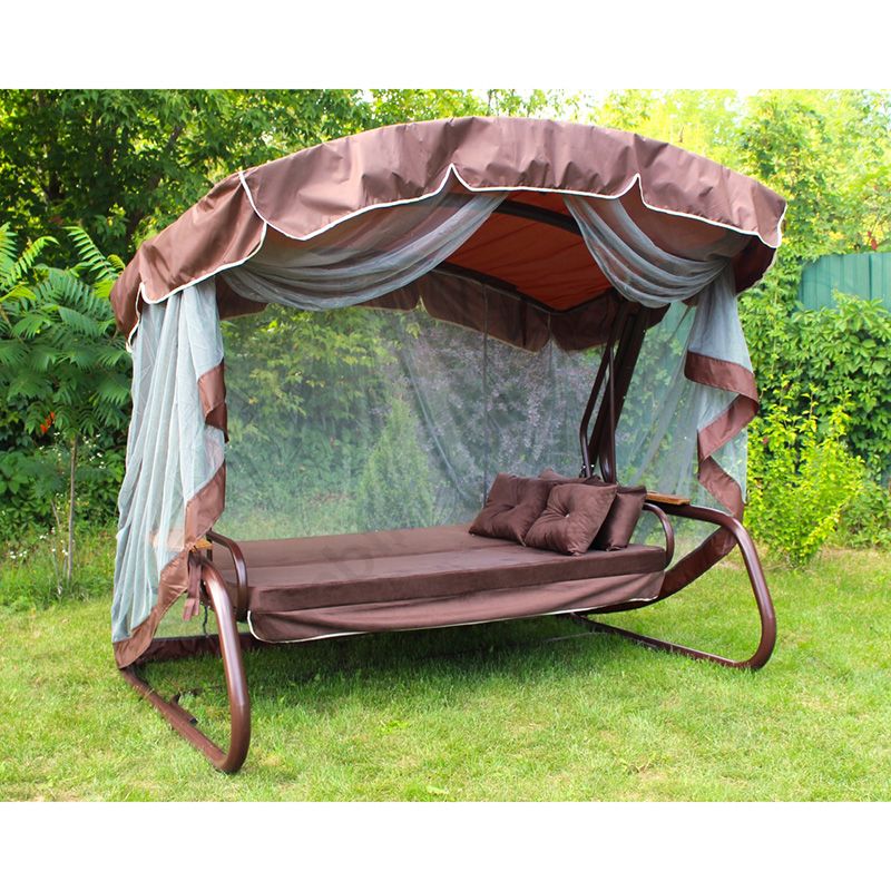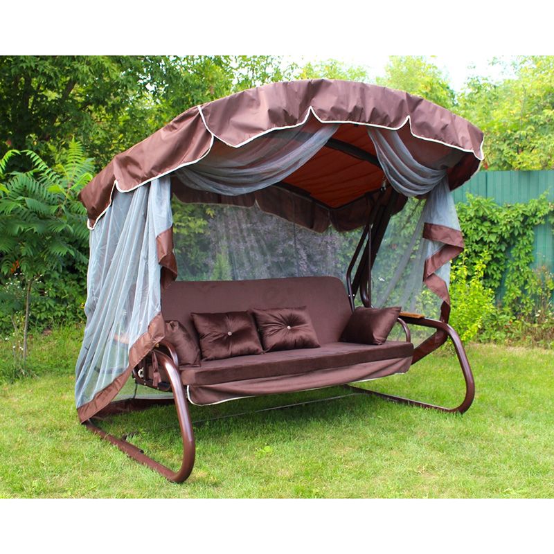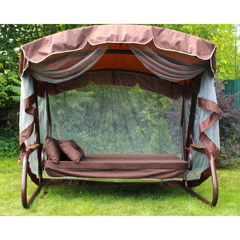 Садова гойдалка з відкидною спинкою та москітною сіткою на коричневому каркасі.