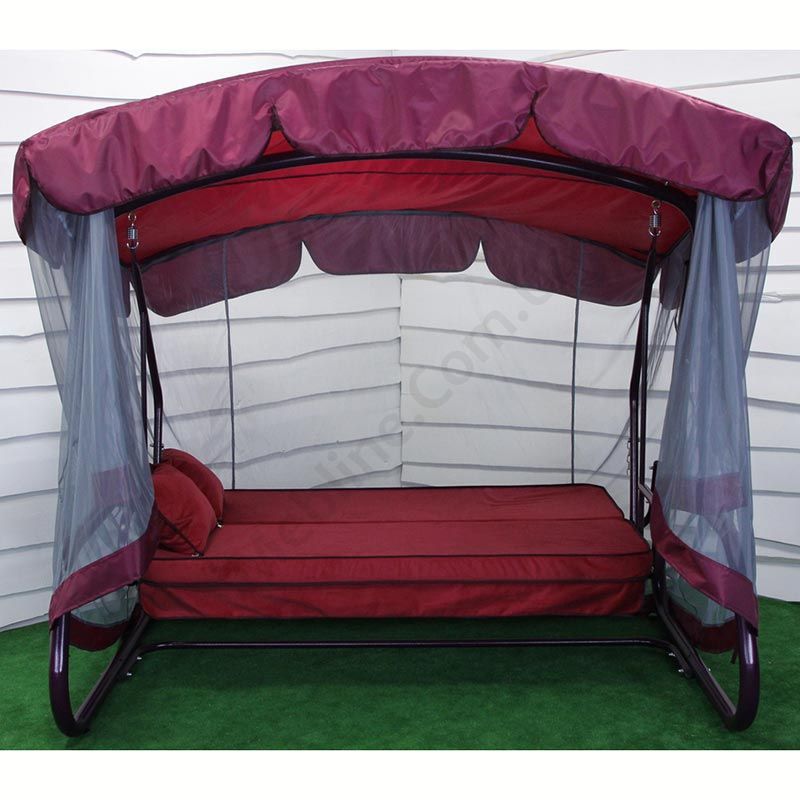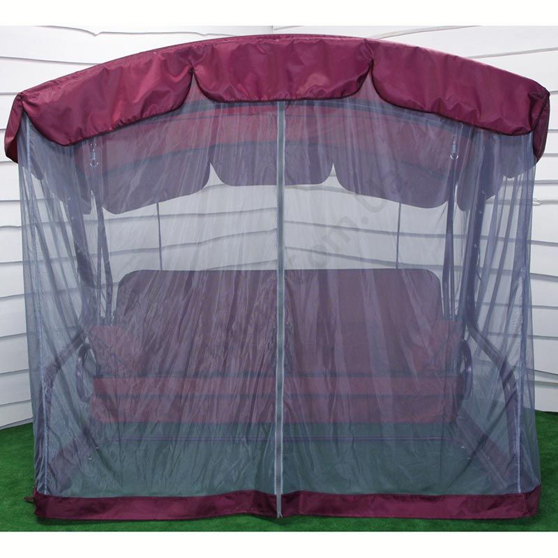 Садова гойдалка з відкидною спинкою та москітною сіткою на фіолетовому каркасі.