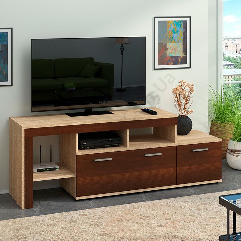 Тумба під телевізор з дверцятами та відкритими полицями.