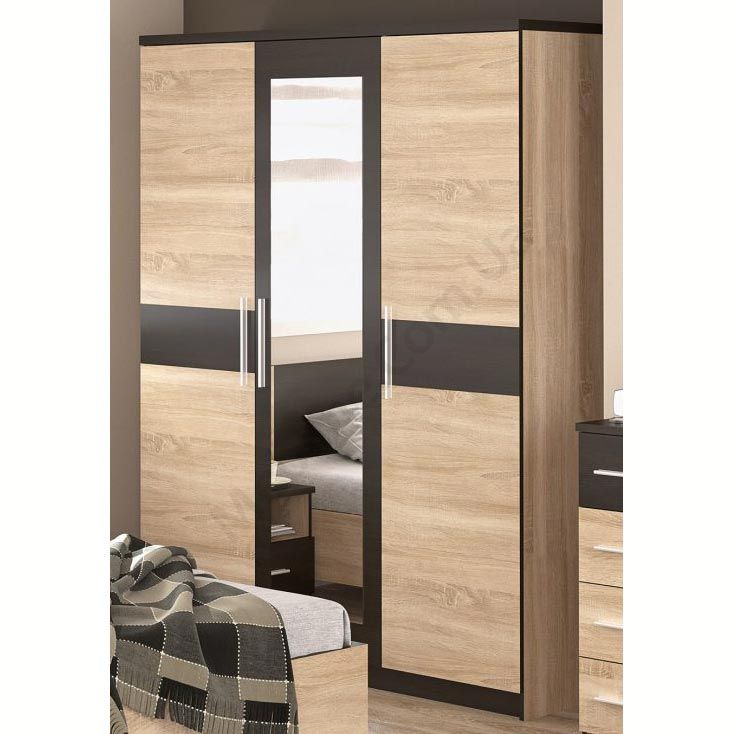 Тридверна шафа з дзеркалом, штангою для одягу та полицями.
