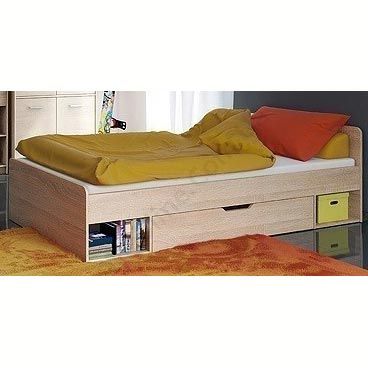Односпальне ліжко з шухлядою для зберігання та відкритими полицями.