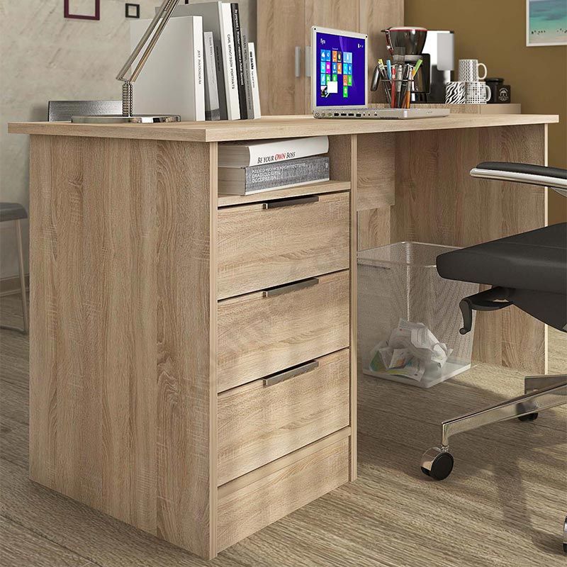 Комп’ютерний стіл з трьома висувними шухлядами та відкритою полицею.