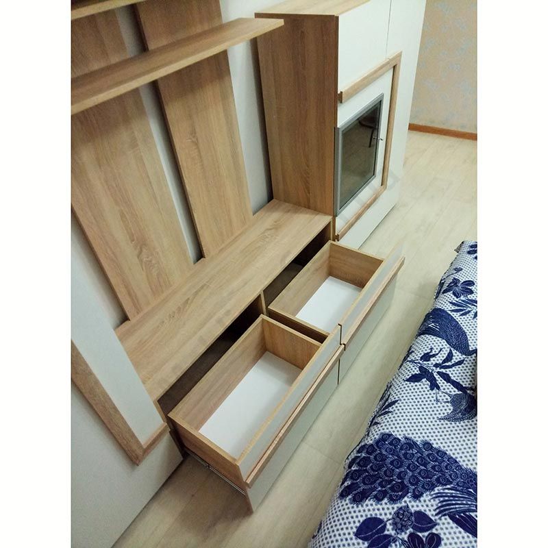 Над тумбою панель з відкритими полицями та навісною шафкою.