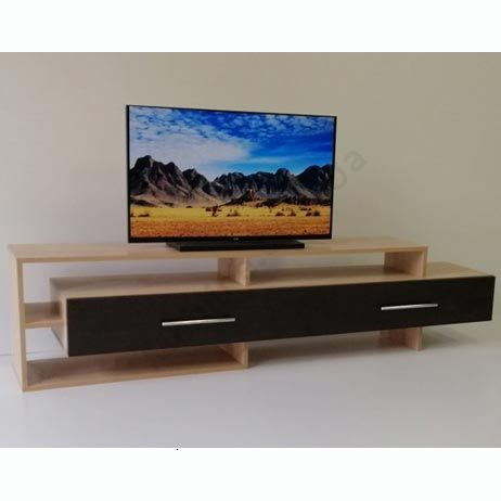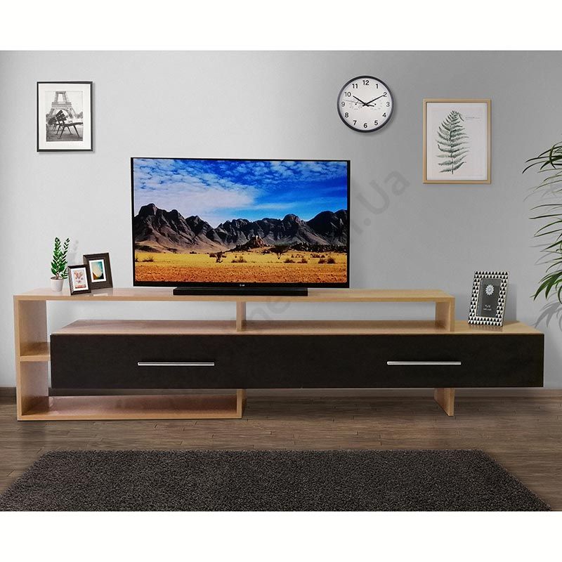 Тумба під телевізор з відкритими полицями та шухлядами.