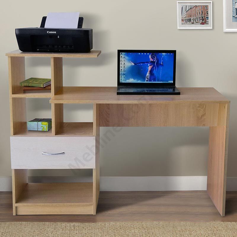 Комп’ютерний стіл із шухлядою та відкритими полицями.