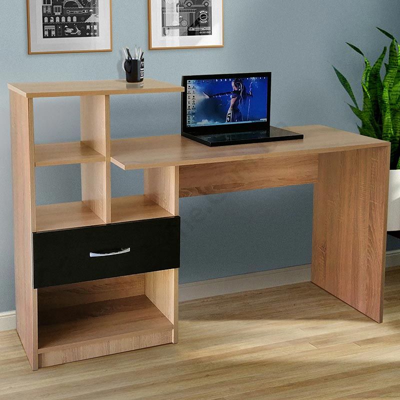 Комп’ютерний стіл із шухлядою та відкритими полицями.