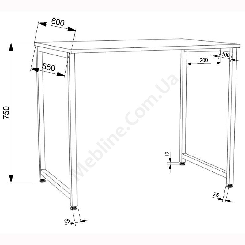 Стільниця виконана з ламінованої ДСП Swiss Krono, завтовшки 16 мм.ДСП має високу щільність, екологічна безпека класу Е1.Протиударна кромка ПВХ, завтовшки 1 мм.Корпус — металева труба 25х25 мм, товщина стінок 1, 5 мм.Можна використовувати як комп’ютерний, письмовий або стіл для ноутбука.Підійде для приміщень у стилі лофт.