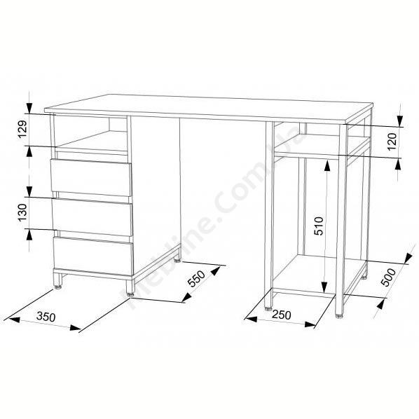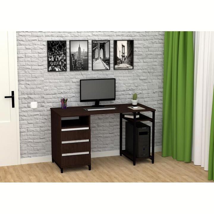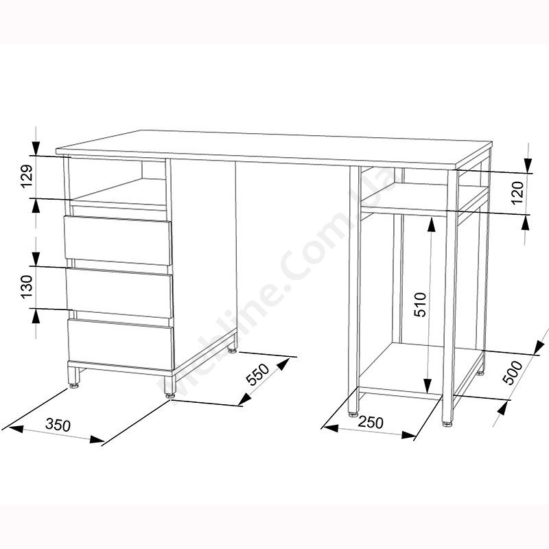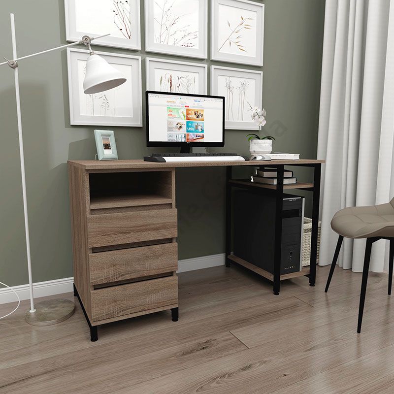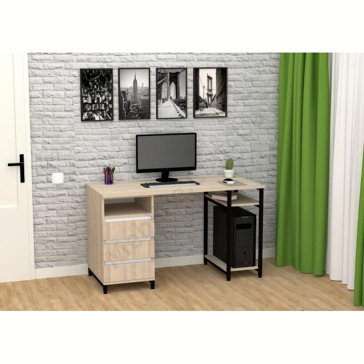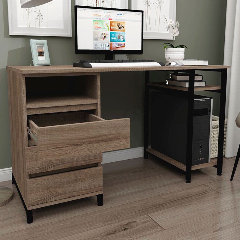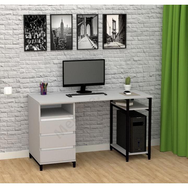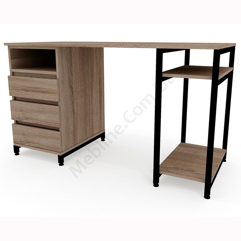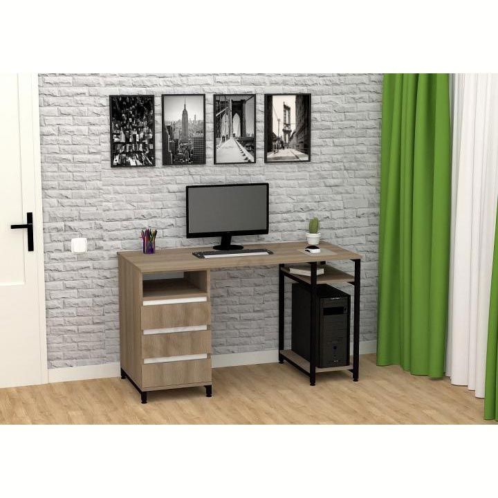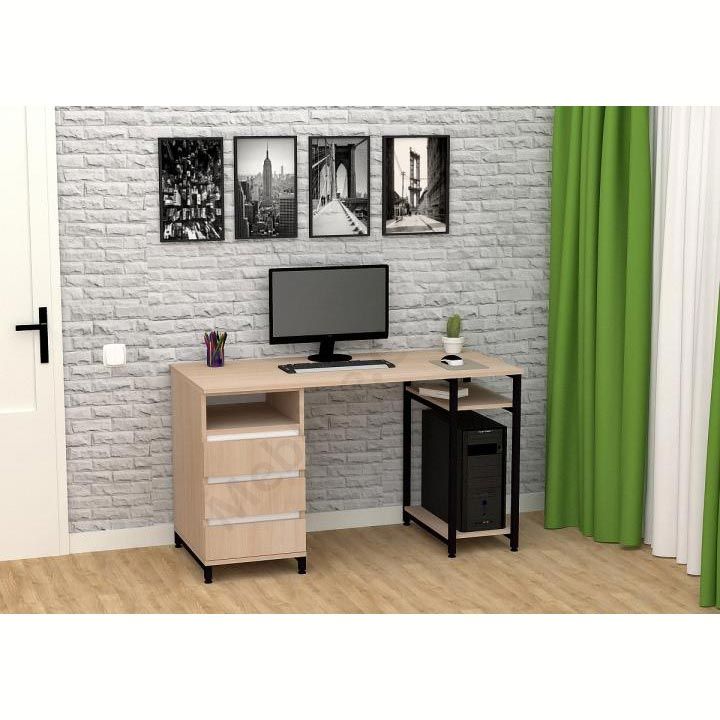 Виконаний з ламінованої ДСП Swiss Krono, завтовшки 16 мм.ДСП має високу щільність, екологічна безпека класу Е1.Протиударна кромка ПВХ, завтовшки 0, 5 та 1 мм.Корпус — металева труба 25х25 мм, товщина стінок 1, 5 мм.Полиця під системний блок та одна відкрита поличка.Тумба з трьома висувними шухлядами та відкритою полицею.Шухляди на телескопічних напрямних (450 мм) DC.Підійде для приміщень у стилі лофт.